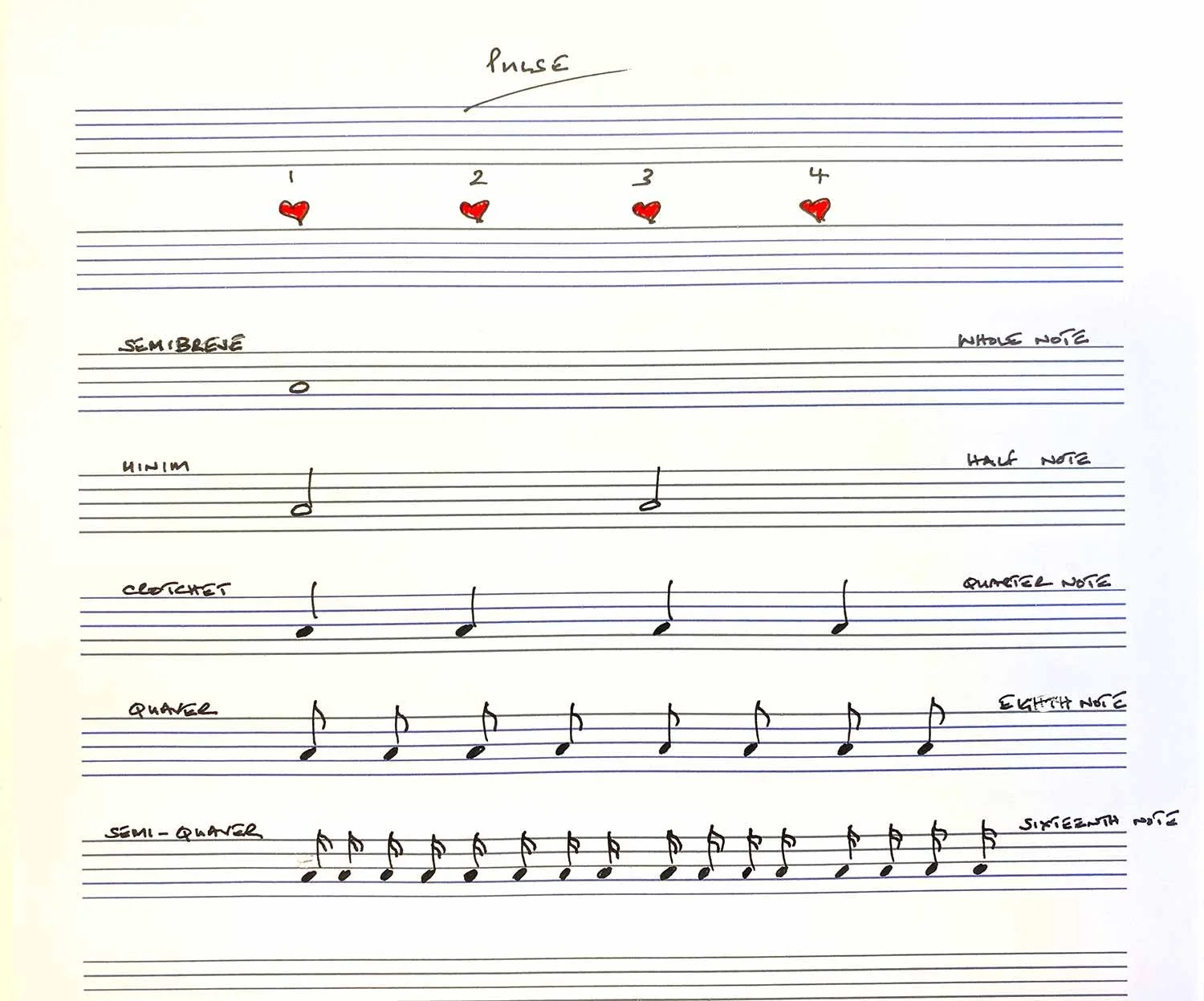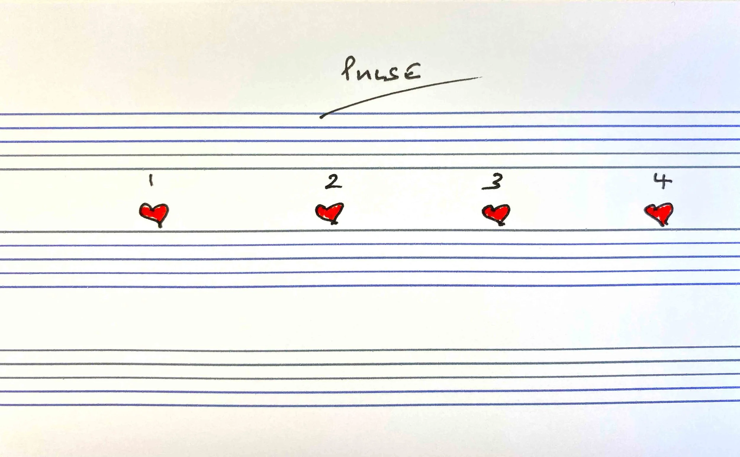 The way that I make sense of note values is by thinking about the idea of pulse, the steady, regular beat in music, like a musical heartbeat. In other words, what we naturally tap our feet to when we listen to a song, for example, 1, 2, 3, 4.